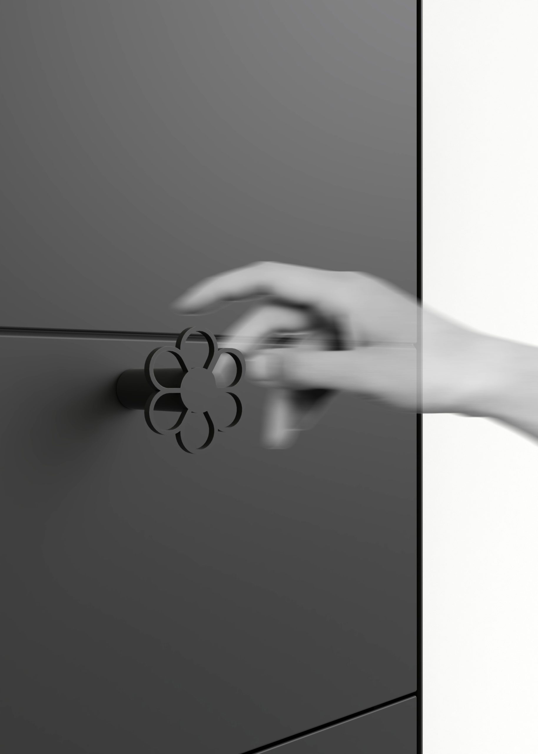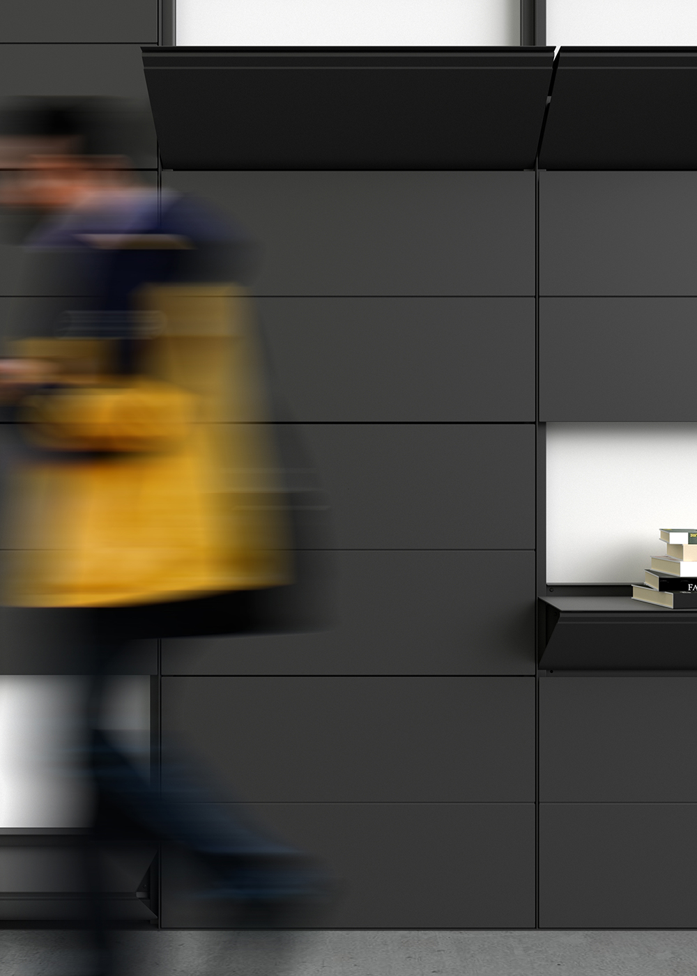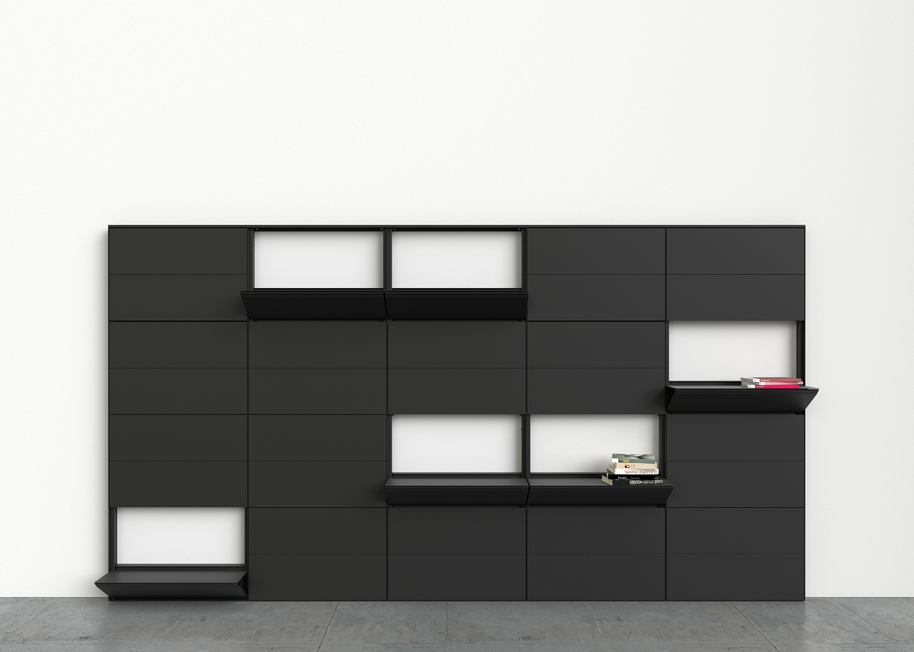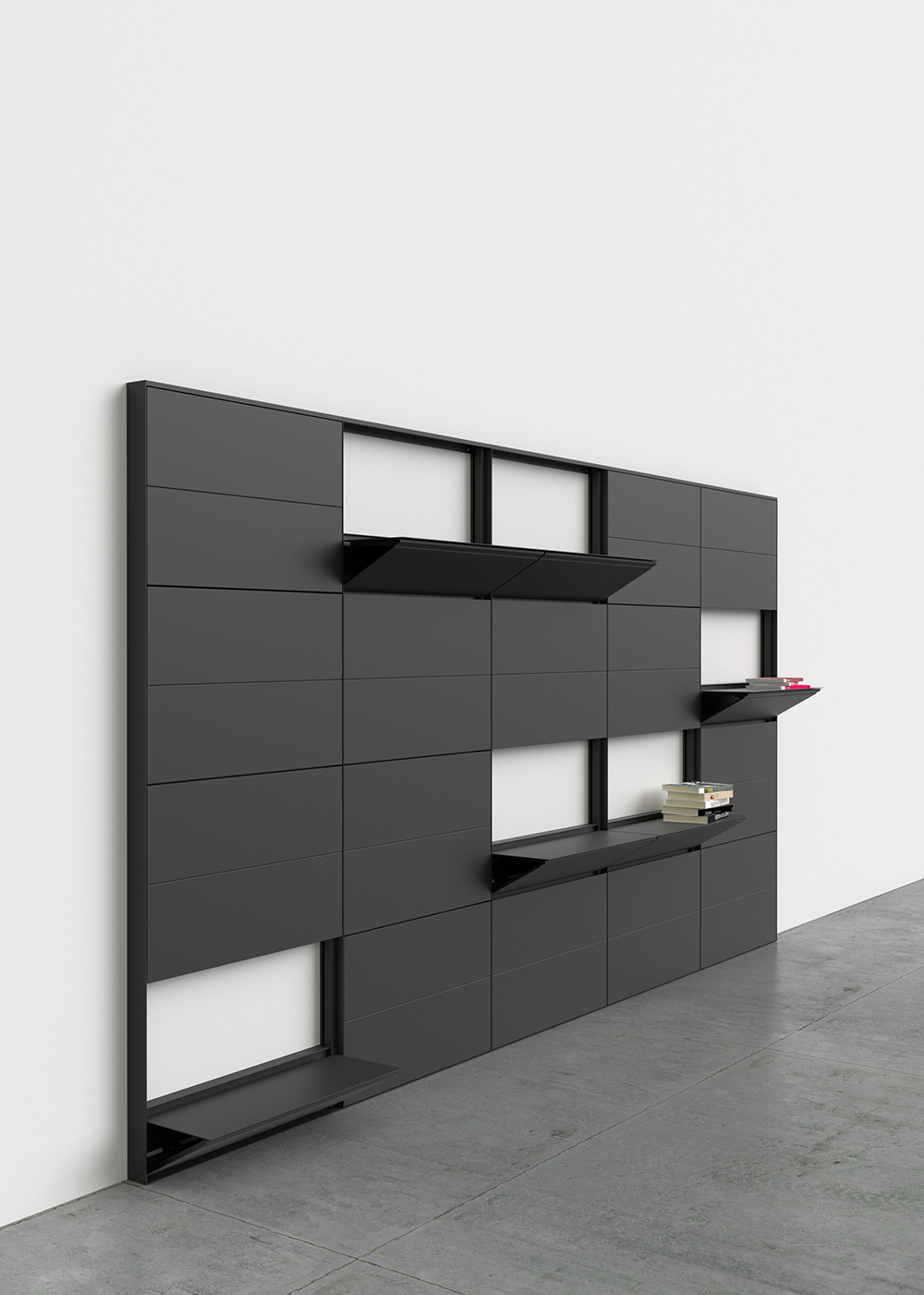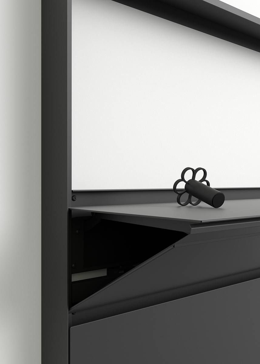 The Flap shelving system enables walls to be clad with shelves in a discreet manner through the use of a retractable system that allows the user to access the shelves according to their needs, whether permanent or temporary. The shelves are opened using a magnetic handle positioned at any point on the shelf. The downward movement is smooth and supported by a damper. Available in four heights (see dimensions below), it accommodates up to 4 shelves per module. When opened, the shelves can serve as a small work surface. The Flap system may be used as a single, standalone module or combined with as many modules as required through the use of starter, extension and end modules.
