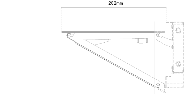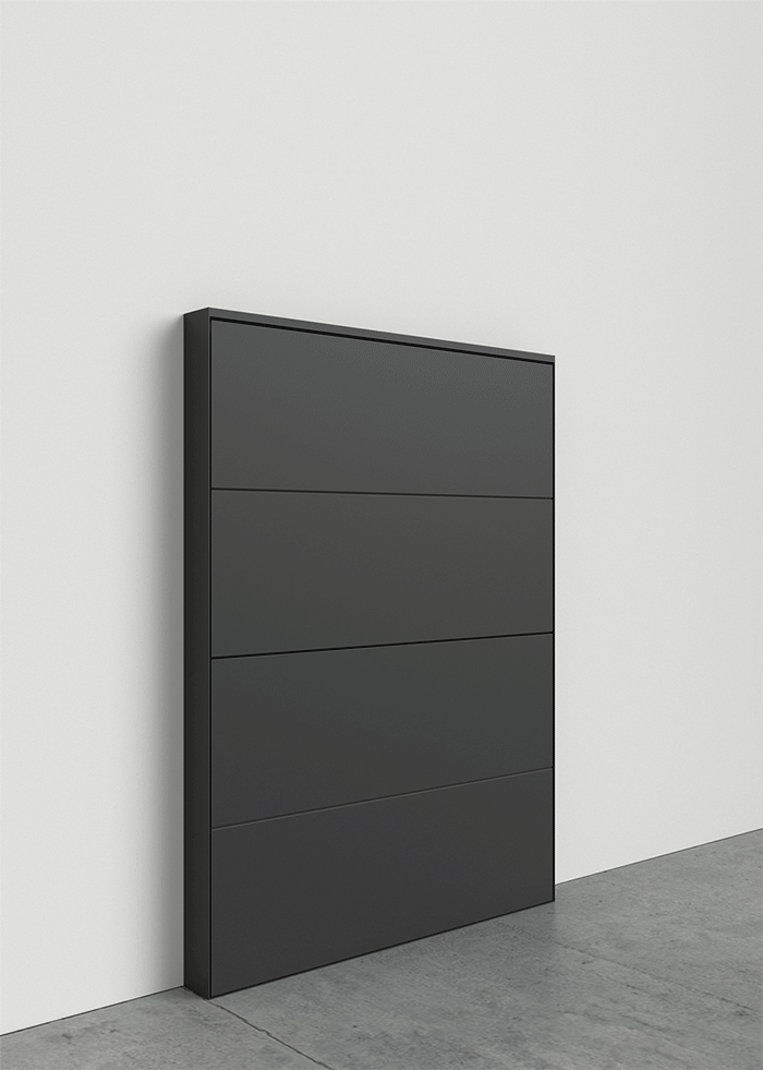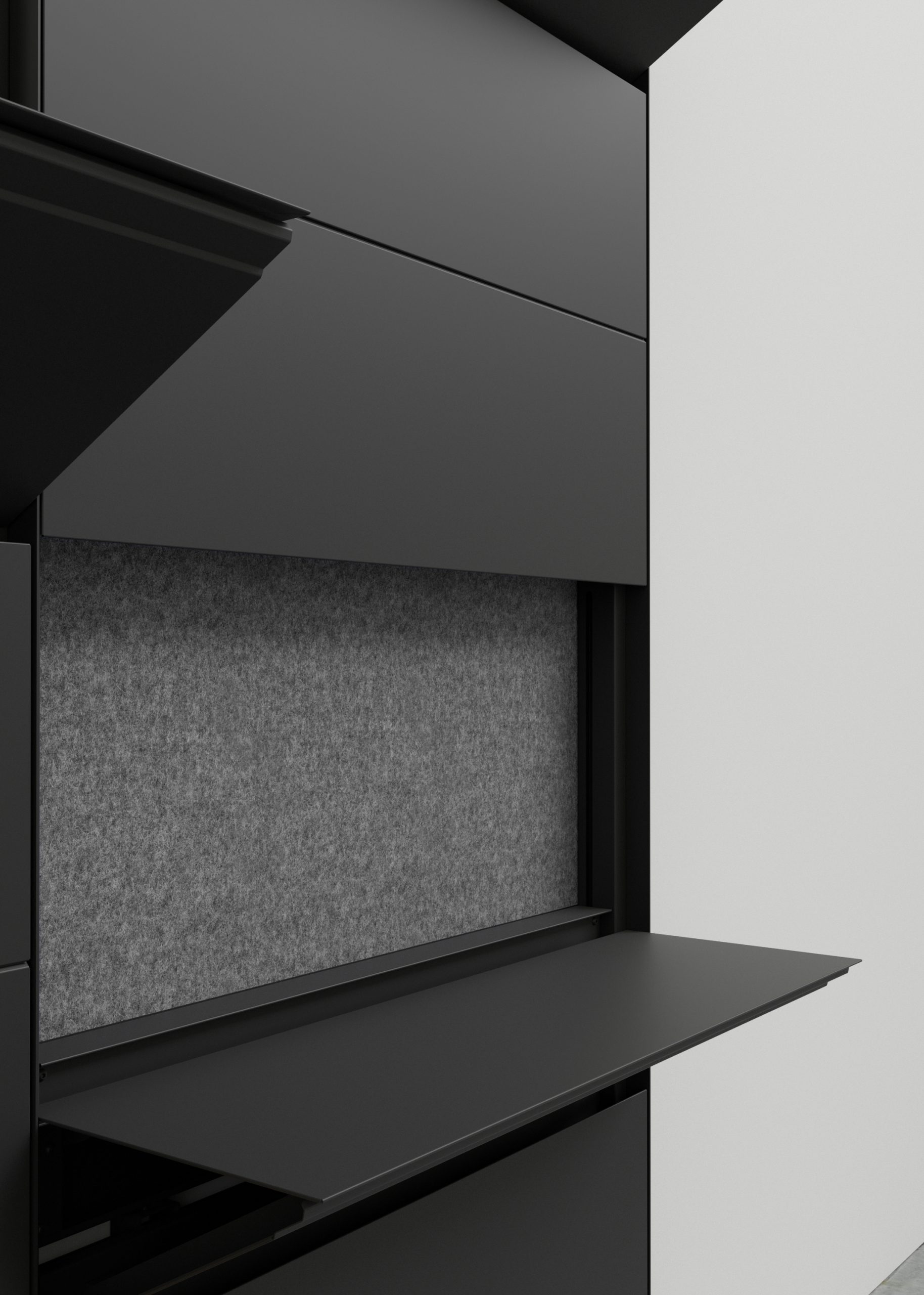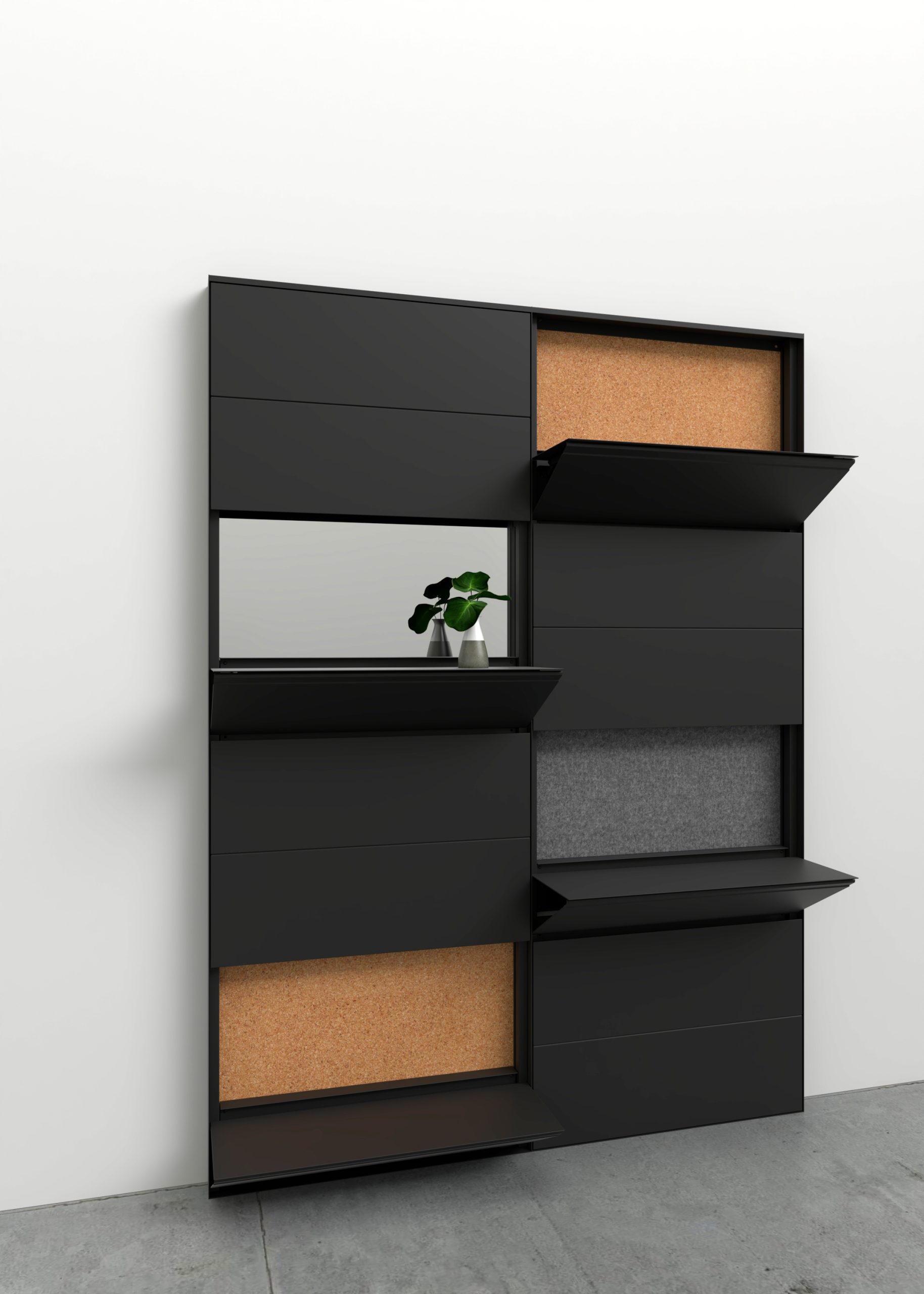 Wall-mounted structure in 50×25×1.5 mm rectangular section tube, with a 2 mm thick sheet metal frame applied around its entire perimeter. The tube features slots to allow the shelves to slide.The shelves are manufactured from steel sheet in various thicknesses, with the two main panels made from 1.2 mm thick steel sheet. The shelf is opened using one magnetic push latch. Each shelf is fitted with one damper to ensure a smooth downward motion. All metal components are finished with an epoxy powder coating for indoor use. Suitable for installation on masonry or plasterboard walls.