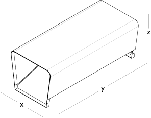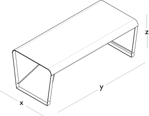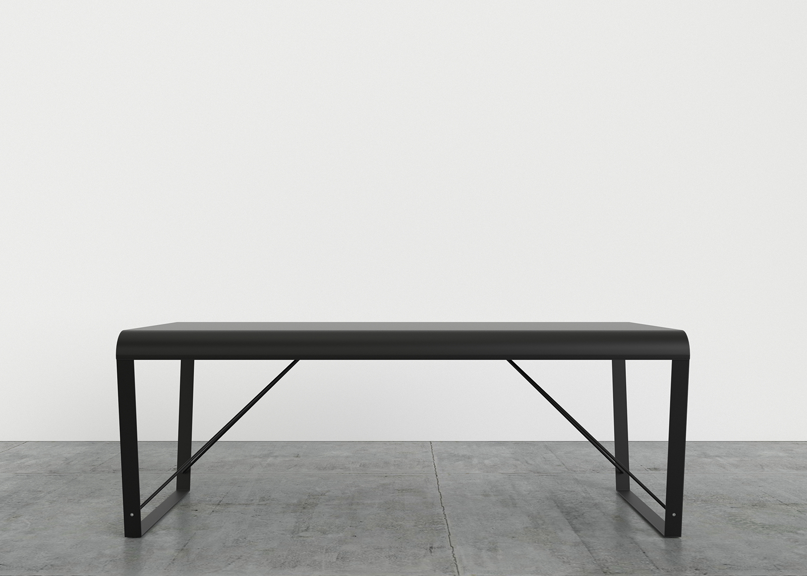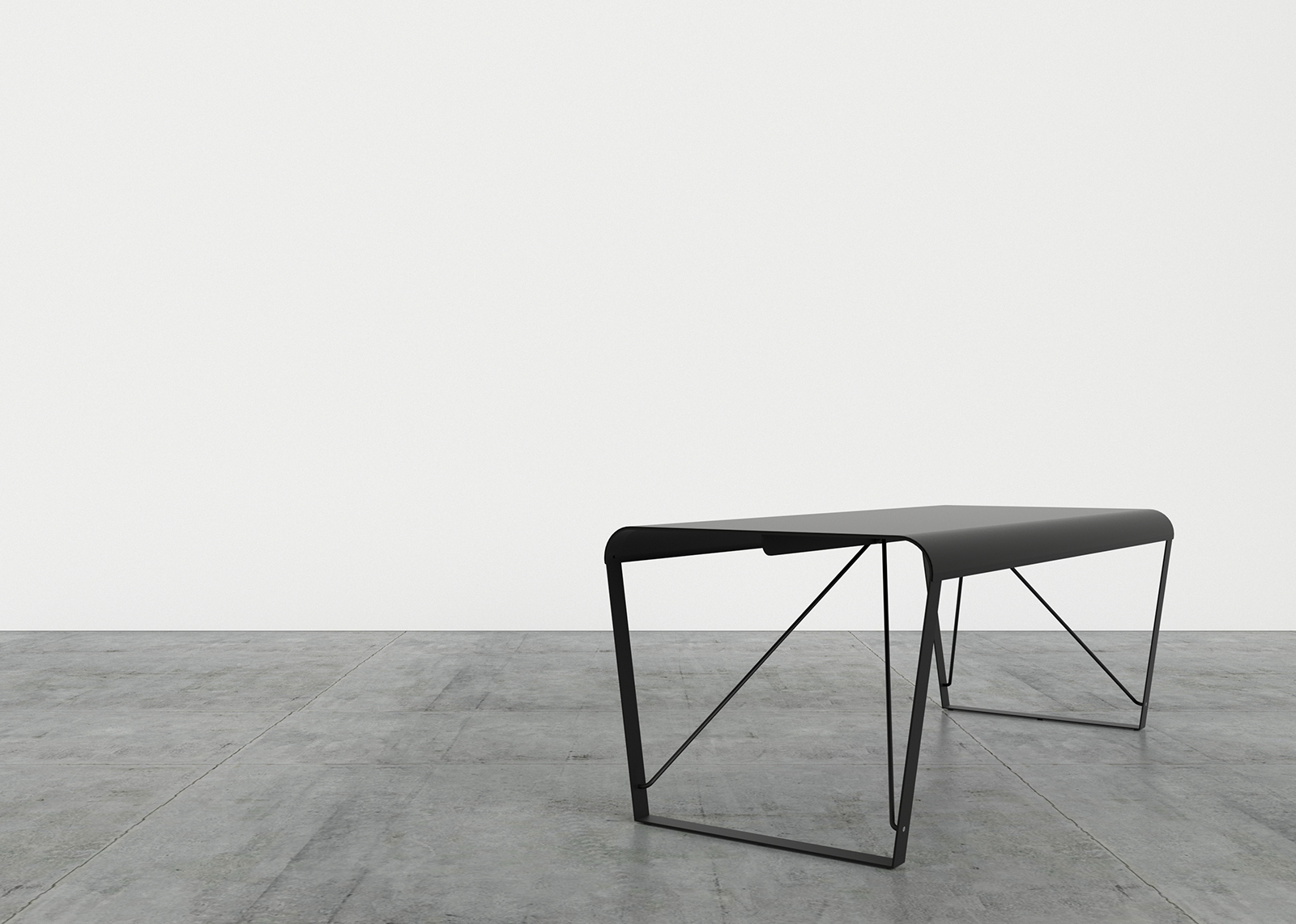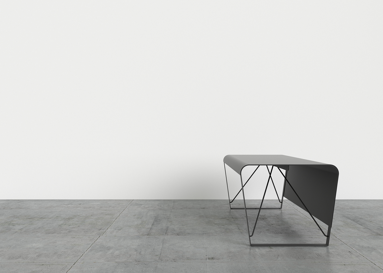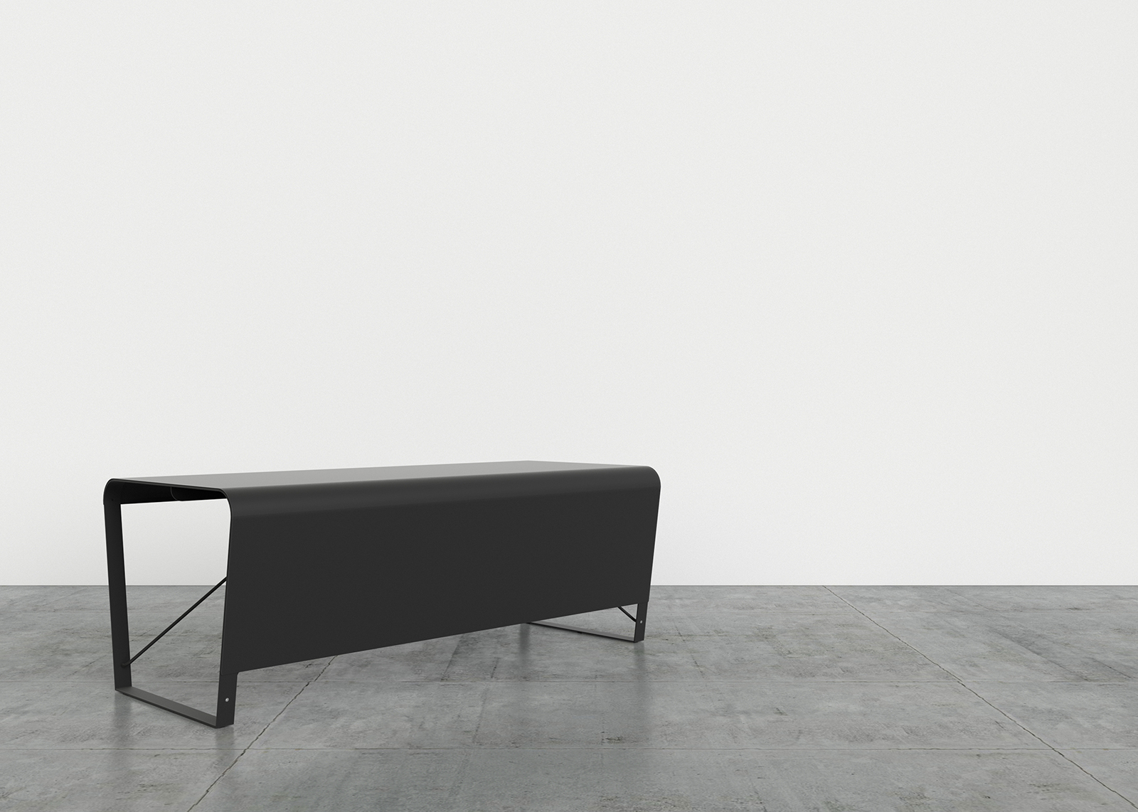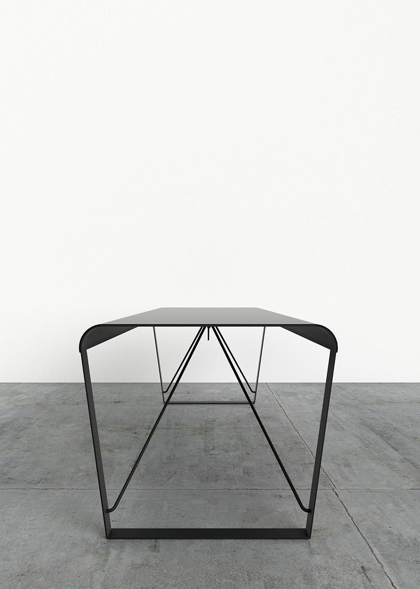 Top made from curved steel sheet with a thickness of 2 mm. In the case of the desk, the top extends and also serves as a frontal panel, maintaining the 2 mm thickness. Leg and frame made from 5 mm thick steel sheet, welded to the top. Bracing made from steel rod with a diameter of 12 mm, bolted to the leg and frame. Metal components finished with epoxy powder coating for indoor use. Floor support in black nylon.
